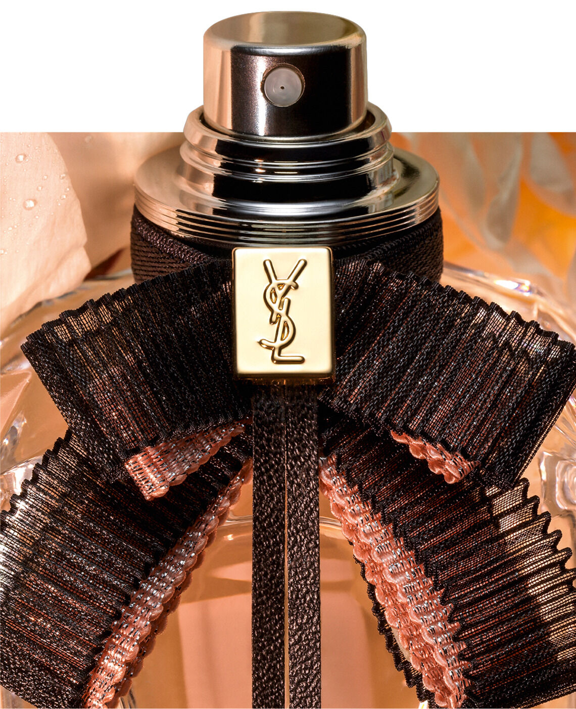 The iconic faceted case is adorned with a shimmering lavaliere, covered with a transparent black organza pleat, directly inspired by a romantic piece of Saint Laurent Couture: the Plissé Lumière.